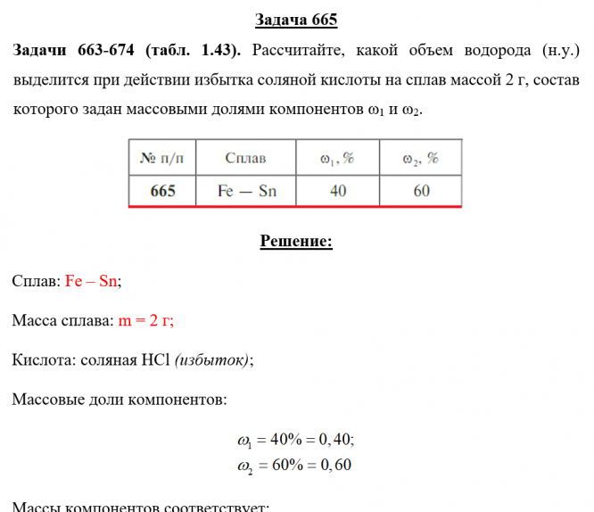 Главная » Учебные материалы » Химия » Решения задач » Несколько классов/семестров » Номер 665 » Задача 665 - Рассчитайте, какой объем водорода (н.у.) выделится при действии избытка соляной кислоты на сплав массой 2 г, состав которого задан массовыми долями компонентов ω1 и ω2.