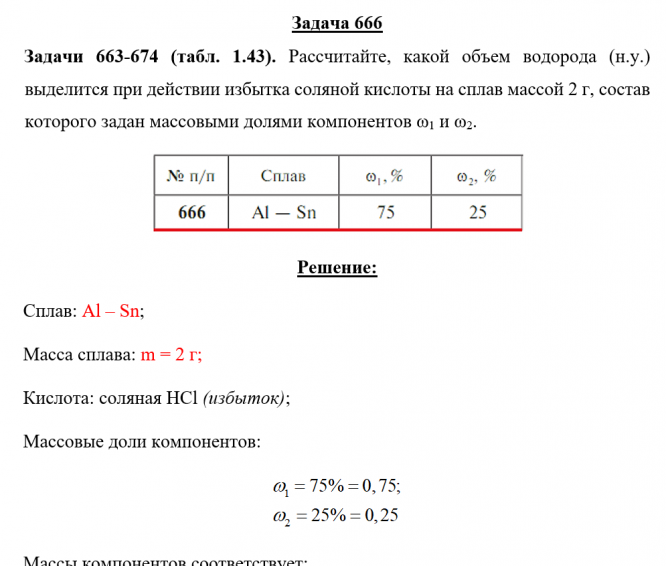 Главная » Учебные материалы » Химия » Решения задач » Несколько классов/семестров » Номер 666 » Задача 666 - Рассчитайте, какой объем водорода (н.у.) выделится при действии избытка соляной кислоты на сплав массой 2 г, состав которого задан массовыми долями компонентов ω1 и ω2.