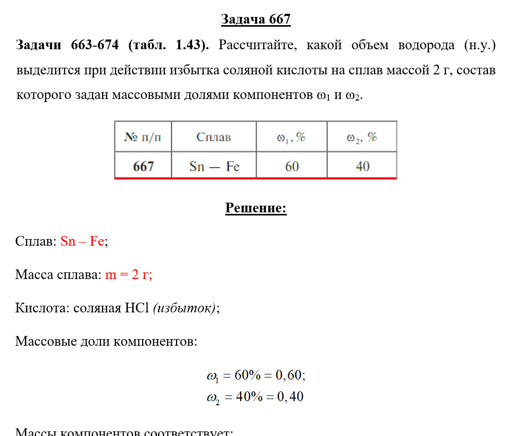 Задача 667 - Рассчитайте, какой объем водорода (н.у.) выделится при действии избытка соляной кислоты на сплав массой 2 г, состав которого задан массовыми долями компонентов ω1 и ω2.