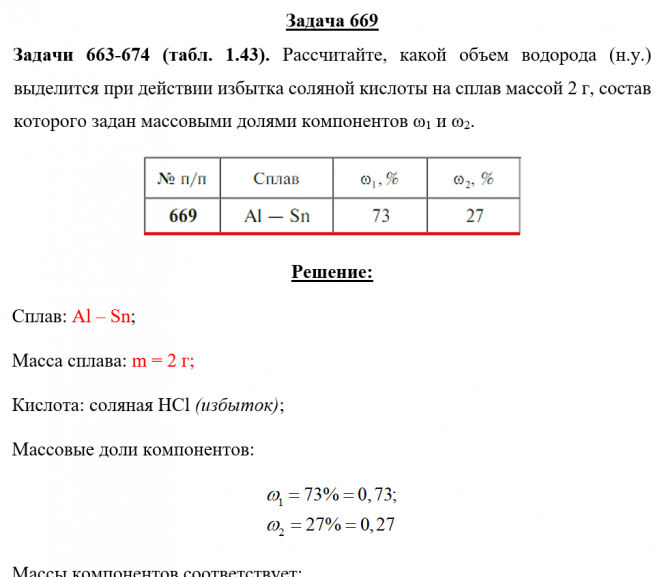 Задача 669 - Рассчитайте, какой объем водорода (н.у.) выделится при действии избытка соляной кислоты на сплав массой 2 г, состав которого задан массовыми долями компонентов ω1 и ω2.