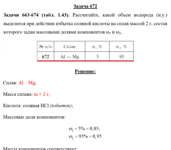 Главная » Учебные материалы » Химия » Решения задач » Несколько классов/семестров » Номер 672 » Задача 672 - Рассчитайте, какой объем водорода (н.у.) выделится при действии избытка соляной кислоты на сплав массой 2 г, состав которого задан массовыми долями компонентов ω1 и ω2.