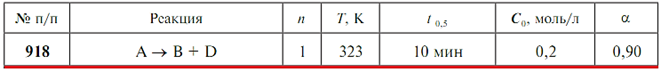 Задачи 916-930 (табл. 2.15). Для данной элементарной химической реакции при заданных температуре Т, порядке реакции n, начальных концентрациях реагентов С0, времени полупревращения t0,5 определите время tα, за которое прореагирует указанная доля исходного вещества α.
