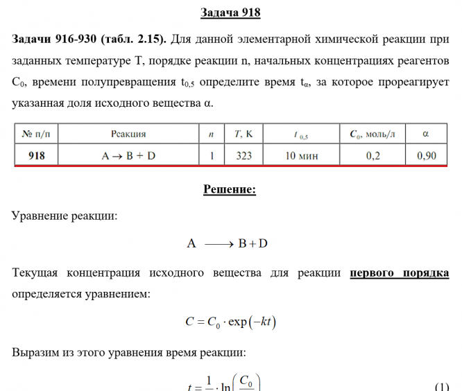 Главная » Учебные материалы » Химия » Решения задач » Несколько классов/семестров » Номер 918 » Задача 918 - Для данной элементарной химической реакции при заданных температуре Т, порядке реакции n, начальных концентрациях реагентов С0, времени полупревращения t0,5 определите время tα, за которое прореагирует указанная доля исходного вещества α