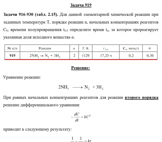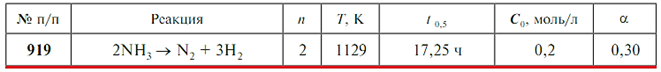 Задачи 916-930 (табл. 2.15). Для данной элементарной химической реакции при заданных температуре Т, порядке реакции n, начальных концентрациях реагентов С0, времени полупревращения t0,5 определите время tα, за которое прореагирует указанная доля исходного вещества α.
