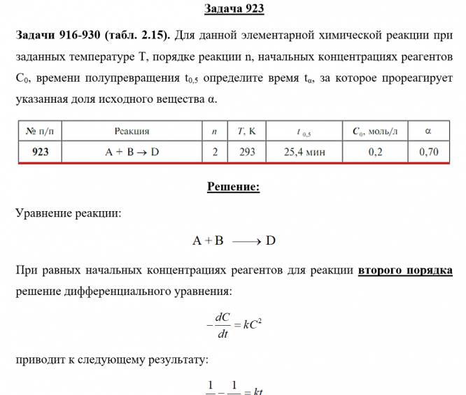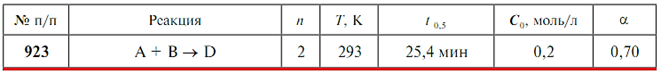 Главная » Учебные материалы » Химия » Решения задач » Несколько классов/семестров » Номер 923 » Задача 923 - Для данной элементарной химической реакции при заданных температуре Т, порядке реакции n, начальных концентрациях реагентов С0, времени полупревращения t0,5 определите время tα, за которое прореагирует указанная доля исходного вещества α