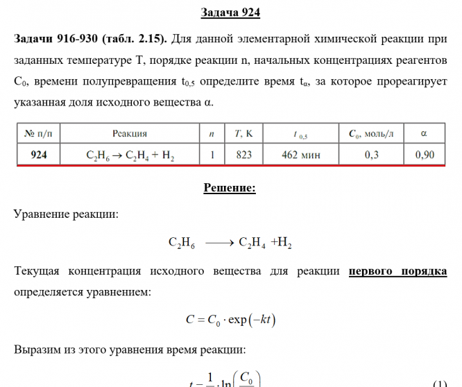 Задачи 916-930 (табл. 2.15). Для данной элементарной химической реакции при заданных температуре Т, порядке реакции n, начальных концентрациях реагентов С0, времени полупревращения t0,5 определите время tα, за которое прореагирует указанная доля исходного вещества α.