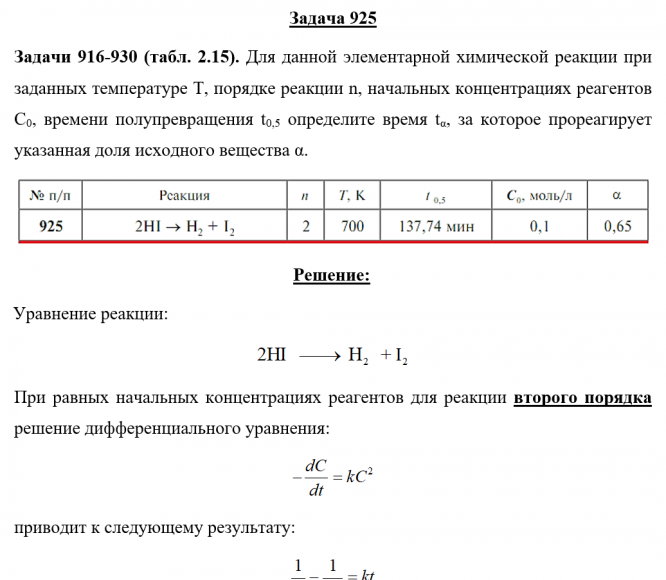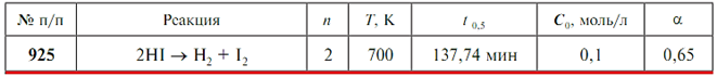 Задачи 916-930 (табл. 2.15). Для данной элементарной химической реакции при заданных температуре Т, порядке реакции n, начальных концентрациях реагентов С0, времени полупревращения t0,5 определите время tα, за которое прореагирует указанная доля исходного вещества α.