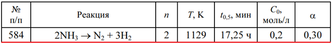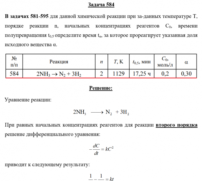 Задача 584 - для данной химической реакции при за-данных температуре Т, порядке реакции n, начальных концентрациях реагентов С0, времени полупревращения t0,5 определите время tα, за которое прореагирует указанная доля исходного вещества α.