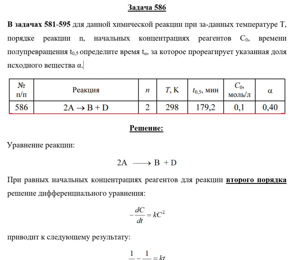 Задача 586 - для данной химической реакции при за-данных температуре Т, порядке реакции n, начальных концентрациях реагентов С0, времени полупревращения t0,5 определите время tα, за которое прореагирует указанная доля исходного вещества α.