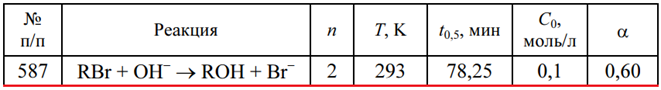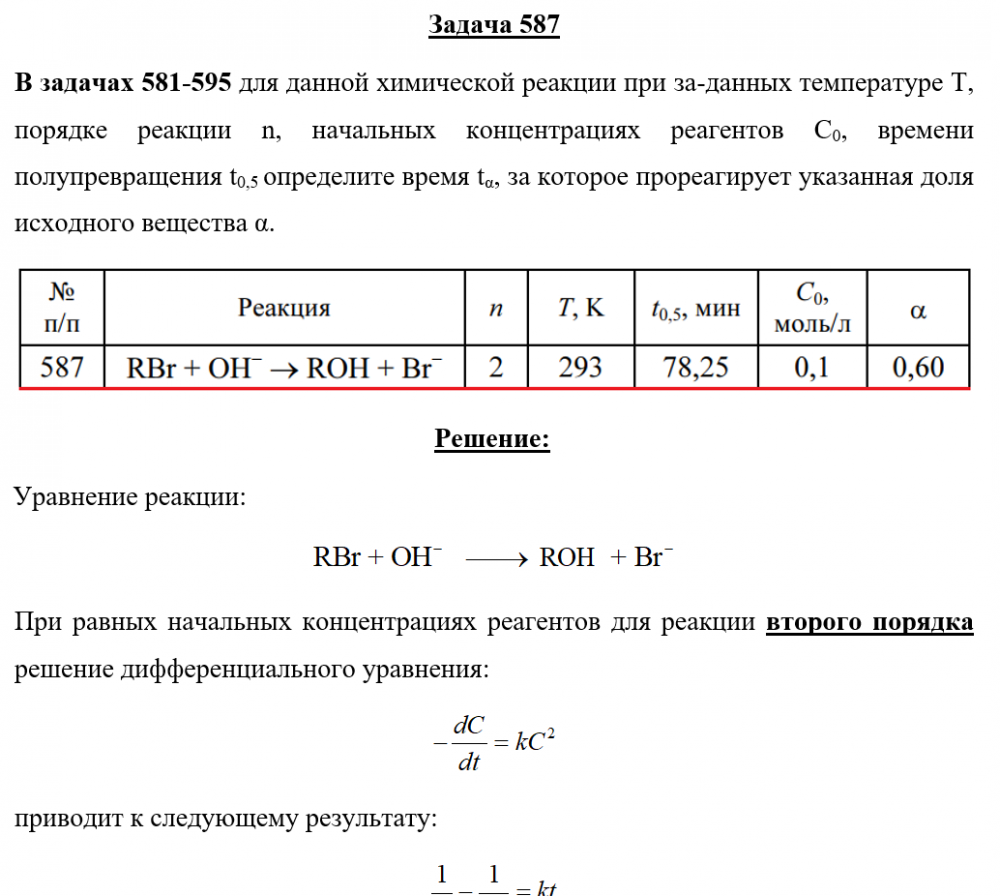 Задача 587 - для данной химической реакции при за-данных температуре Т, порядке реакции n, начальных концентрациях реагентов С0, времени полупревращения t0,5 определите время tα, за которое прореагирует указанная доля исходного вещества α.