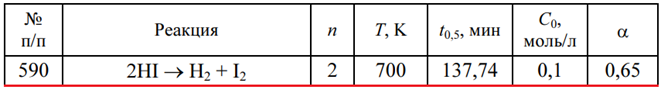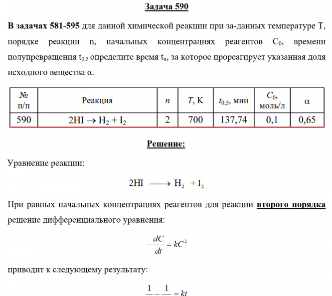 Задача 590 - для данной химической реакции при за-данных температуре Т, порядке реакции n, начальных концентрациях реагентов С0, времени полупревращения t0,5 определите время tα, за которое прореагирует указанная доля исходного вещества α.