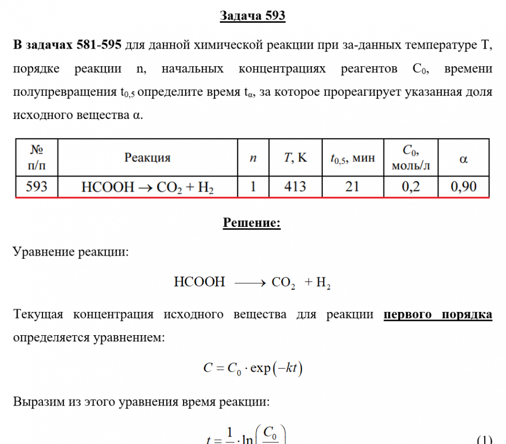 Задача 593 - для данной химической реакции при за-данных температуре Т, порядке реакции n, начальных концентрациях реагентов С0, времени полупревращения t0,5 определите время tα, за которое прореагирует указанная доля исходного вещества α.