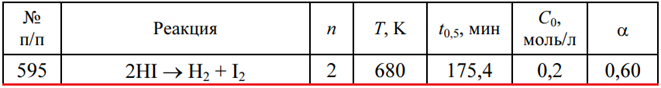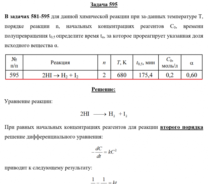Задача 595 - для данной химической реакции при за-данных температуре Т, порядке реакции n, начальных концентрациях реагентов С0, времени полупревращения t0,5 определите время tα, за которое прореагирует указанная доля исходного вещества α.