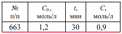 Задача 663 - рассчитайте для элементарной реакции второго порядка А + В → АВ при одинаковых начальных концентрациях реагентов С0 константу скорости реакции и время полупревращения t0,5, если известно, что через некоторое время t концентрация вещества
