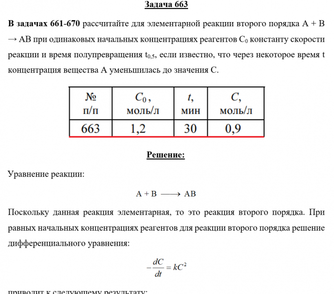 Для студентов по предмету ХимияЗадача 663 - рассчитайте для элементарной реакции второго порядка А + В → АВ при одинаковых начальных концентрациях реагентов С0 константу скорости реЗадача 663 - рассчитайте для элементарной реакции второго порядка А + В → АВ при одинаковых начальных концентрациях реагентов С0 константу скорости ре