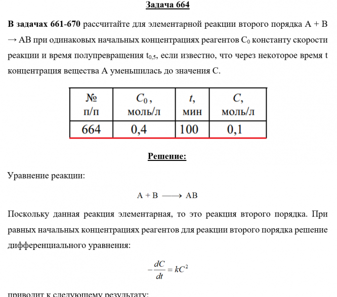 Для студентов по предмету ХимияЗадача 664 - рассчитайте для элементарной реакции второго порядка А + В → АВ при одинаковых начальных концентрациях реагентов С0 константу скорости реЗадача 664 - рассчитайте для элементарной реакции второго порядка А + В → АВ при одинаковых начальных концентрациях реагентов С0 константу скорости ре