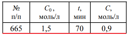 Задача 665 - рассчитайте для элементарной реакции второго порядка А + В → АВ при одинаковых начальных концентрациях реагентов С0 константу скорости реакции и время полупревращения t0,5, если известно, что через некоторое время t концентрация вещества