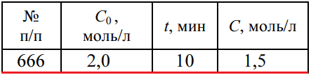 В задачах 661-670 рассчитайте для элементарной реакции второго порядка А + В → АВ при одинаковых начальных концентрациях реагентов С0 константу скорости реакции и время полупревращения t0,5, если известно, что через некоторое время t концентрация вещества А уменьшилась до значения С.