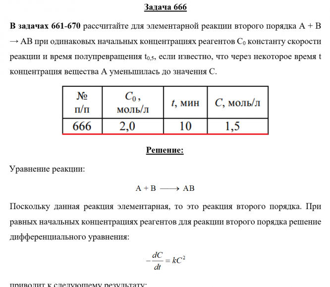 Задача 666 - рассчитайте для элементарной реакции второго порядка А + В → АВ при одинаковых начальных концентрациях реагентов С0 константу скорости реакции и время полупревращения t0,5, если известно, что через некоторое время t концентрация вещества