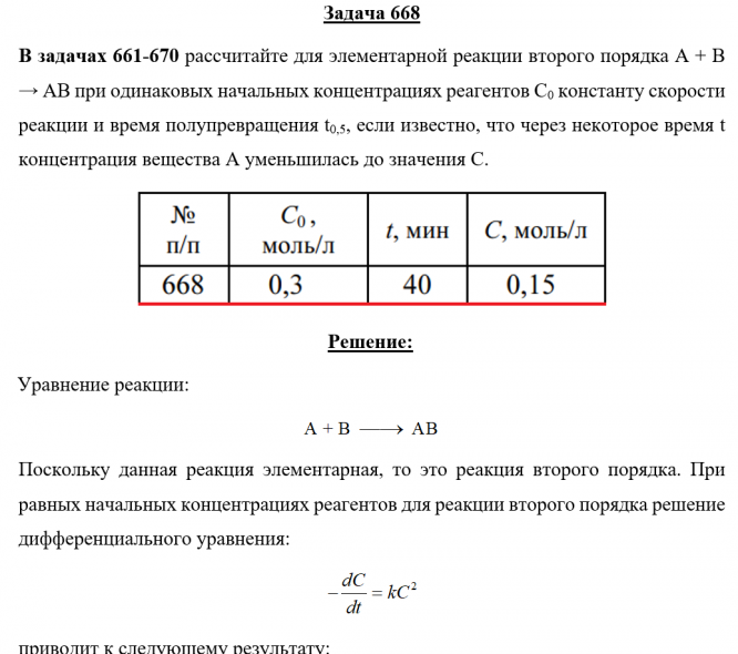 Задача 668 - рассчитайте для элементарной реакции второго порядка А + В → АВ при одинаковых начальных концентрациях реагентов С0 константу скорости реакции и время полупревращения t0,5, если известно, что через некоторое время t концентрация вещества