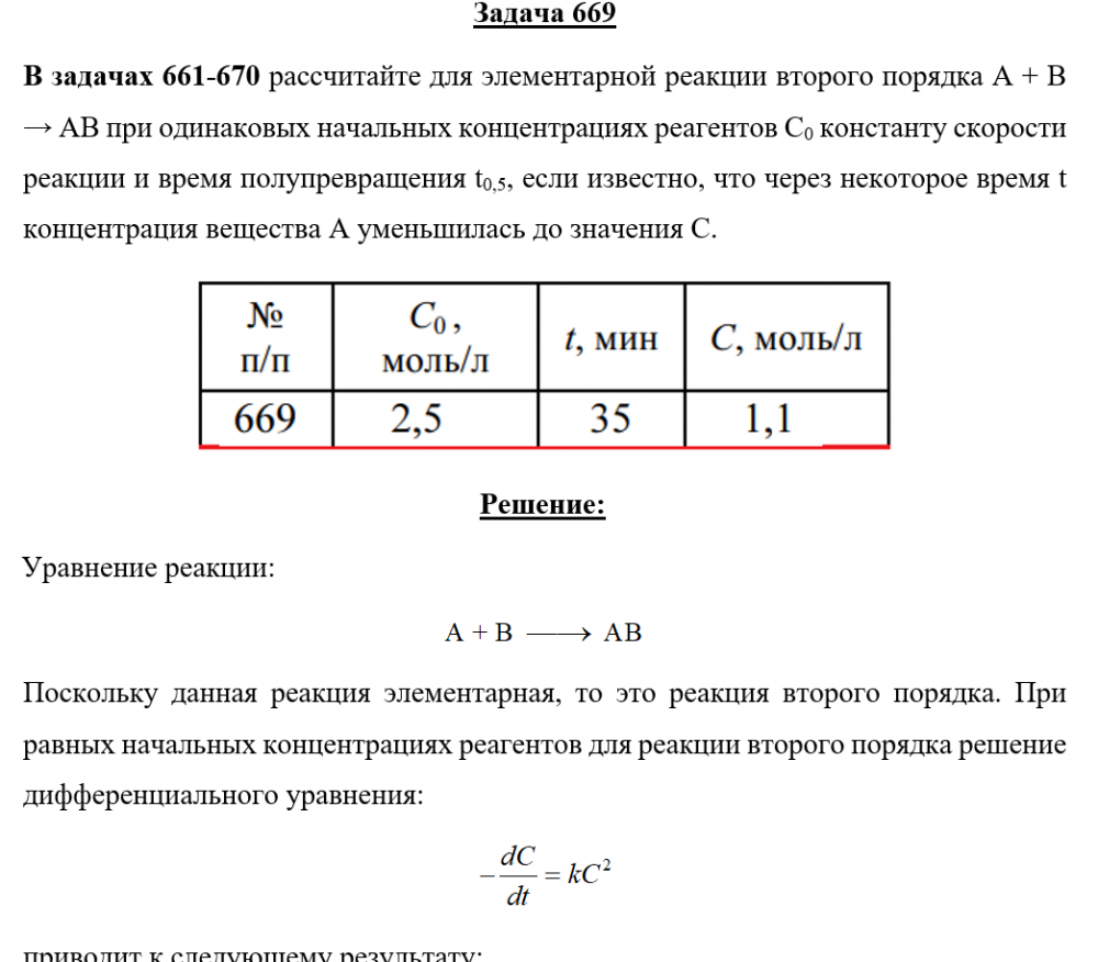 Для студентов по предмету ХимияЗадача 669 - рассчитайте для элементарной реакции второго порядка А + В → АВ при одинаковых начальных концентрациях реагентов С0 константу скорости реЗадача 669 - рассчитайте для элементарной реакции второго порядка А + В → АВ при одинаковых начальных концентрациях реагентов С0 константу скорости ре