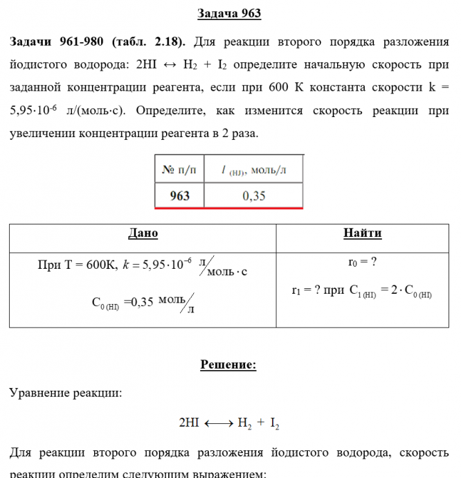Задачи 961-980 (табл. 2.18). Для реакции второго порядка разложения йодистого водорода: 2HI ↔ H2 + I2 определите начальную скорость при заданной концентрации реагента, если при 600 К константа скорости k = 5,95 ⋅ 10-6 л/моль⋅с. Определите, как изменится скорость реакции при увеличении концентрации реагента в 2 раза.