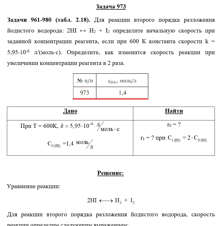 Задачи 961-980 (табл. 2.18). Для реакции второго порядка разложения йодистого водорода: 2HI ↔ H2 + I2 определите начальную скорость при заданной концентрации реагента, если при 600 К константа скорости k = 5,95 ⋅ 10-6 л/моль⋅с. Определите, как изменится скорость реакции при увеличении концентрации реагента в 2 раза..