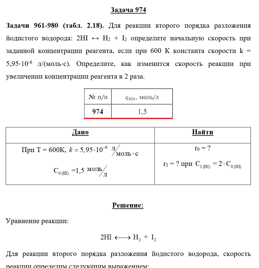 Задачи 961-980 (табл. 2.18). Для реакции второго порядка разложения йодистого водорода: 2HI ↔ H2 + I2 определите начальную скорость при заданной концентрации реагента, если при 600 К константа скорости k = 5,95 ⋅ 10-6 л/моль⋅с. Определите, как изменится скорость реакции при увеличении концентрации реагента в 2 раза..