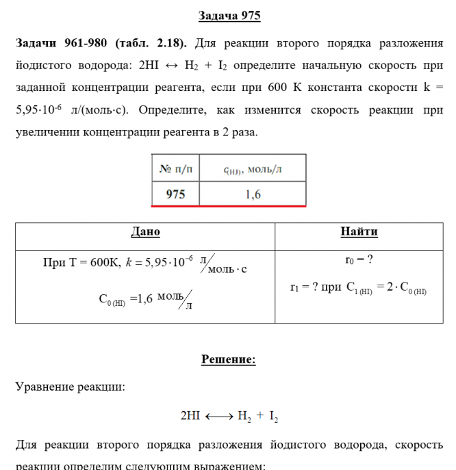 Задачи 961-980 (табл. 2.18). Для реакции второго порядка разложения йодистого водорода: 2HI ↔ H2 + I2 определите начальную скорость при заданной концентрации реагента, если при 600 К константа скорости k = 5,95 ⋅ 10-6 л/моль⋅с. Определите, как изменится скорость реакции при увеличении концентрации реагента в 2 раза.