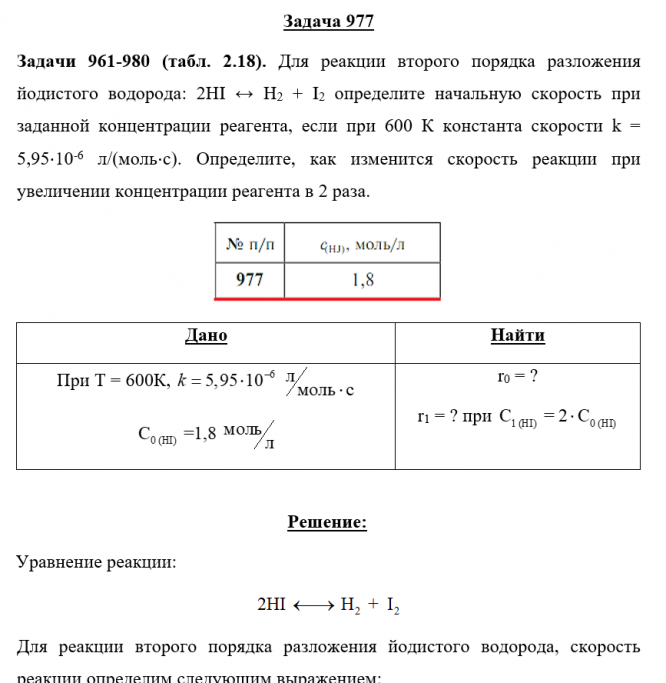 Задачи 961-980 (табл. 2.18). Для реакции второго порядка разложения йодистого водорода: 2HI ↔ H2 + I2 определите начальную скорость при заданной концентрации реагента, если при 600 К константа скорости k = 5,95 ⋅ 10-6 л/моль⋅с. Определите, как изменится скорость реакции при увеличении концентрации реагента в 2 раза.