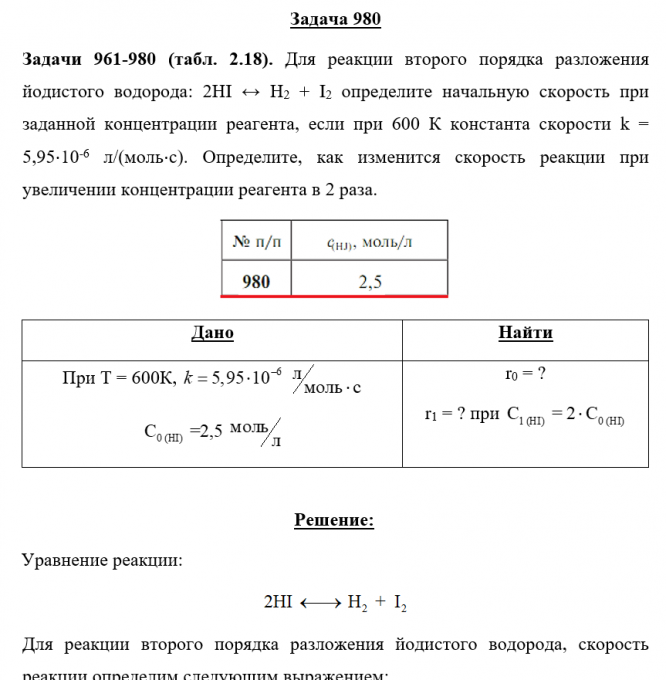 Задачи 961-980 (табл. 2.18). Для реакции второго порядка разложения йодистого водорода: 2HI ↔ H2 + I2 определите начальную скорость при заданной концентрации реагента, если при 600 К константа скорости k = 5,95 ⋅ 10-6 л/моль⋅с. Определите, как изменится скорость реакции при увеличении концентрации реагента в 2 раза.