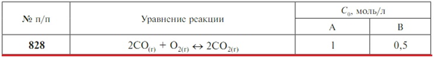 Задачи 827-841 (табл. 2.10). Для данной гомогенной реакции А + В ↔ С + D определите температуру, при которой наступает равновесие. Напишите выражение константы равновесия. Рассчитайте равновесный состав системы при этой температуре, если известны начальные концентрации исходных веществ C0 (продукты реакции в исходной смеси отсутствуют)..