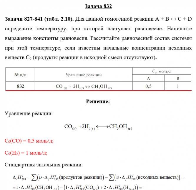 Задача 832 - Для данной гомогенной реакции А + В ↔ С + D определите температуру, при которой наступает равновесие. Напишите выражение константы равновесия. Рассчитайте равновесный состав системы при этой температуре, если известны начальные концентра