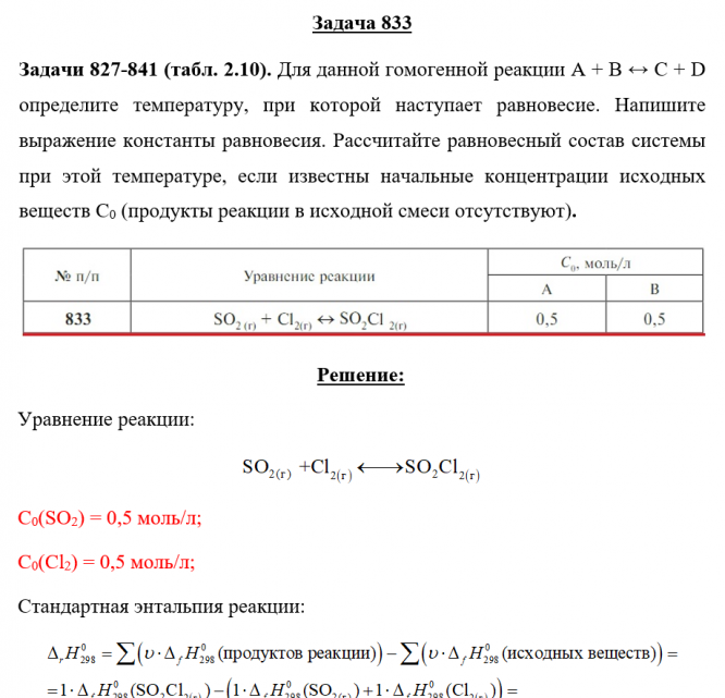 Задача 833 - Для данной гомогенной реакции А + В ↔ С + D определите температуру, при которой наступает равновесие. Напишите выражение константы равновесия. Рассчитайте равновесный состав системы при этой температуре, если известны начальные концентра