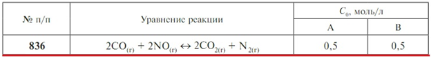 Задачи 827-841 (табл. 2.10). Для данной гомогенной реакции А + В ↔ С + D определите температуру, при которой наступает равновесие. Напишите выражение константы равновесия. Рассчитайте равновесный состав системы при этой температуре, если известны начальные концентрации исходных веществ C0 (продукты реакции в исходной смеси отсутствуют)..