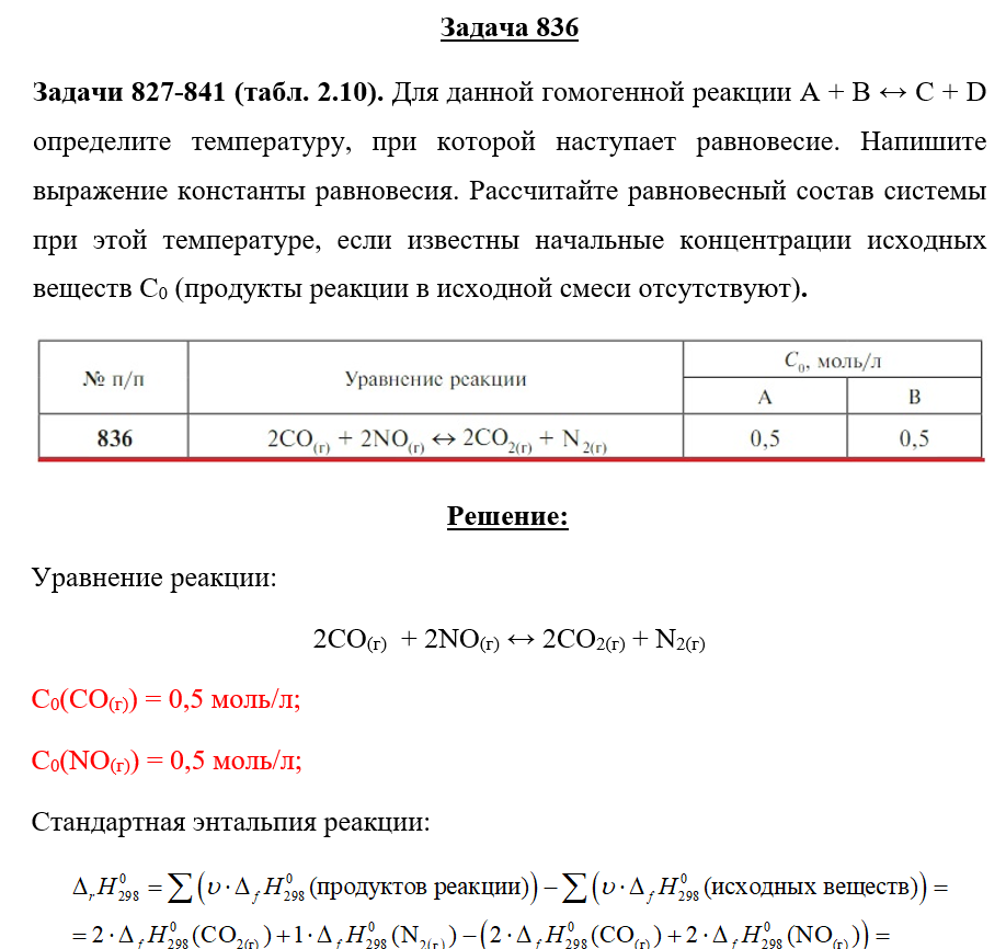 Задачи 827-841 (табл. 2.10). Для данной гомогенной реакции А + В ↔ С + D определите температуру, при которой наступает равновесие. Напишите выражение константы равновесия. Рассчитайте равновесный состав системы при этой температуре, если известны начальные концентрации исходных веществ C0 (продукты реакции в исходной смеси отсутствуют).