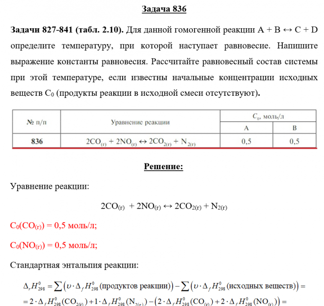 Задача 836 - Для данной гомогенной реакции А + В ↔ С + D определите температуру, при которой наступает равновесие. Напишите выражение константы равновесия. Рассчитайте равновесный состав системы при этой температуре, если известны начальные концентра