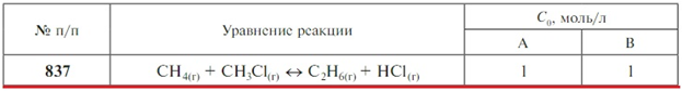 Задачи 827-841 (табл. 2.10). Для данной гомогенной реакции А + В ↔ С + D определите температуру, при которой наступает равновесие. Напишите выражение константы равновесия. Рассчитайте равновесный состав системы при этой температуре, если известны начальные концентрации исходных веществ C0 (продукты реакции в исходной смеси отсутствуют)..