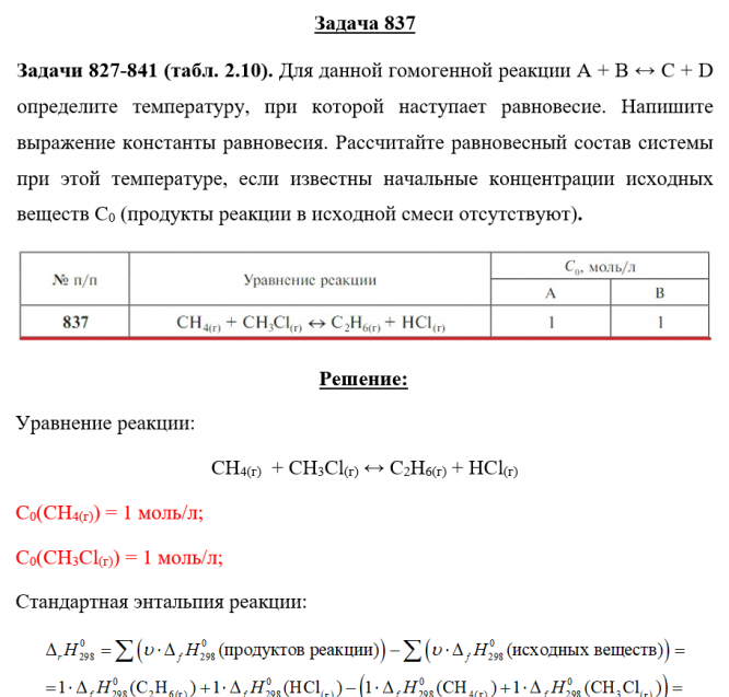 Задачи 827-841 (табл. 2.10). Для данной гомогенной реакции А + В ↔ С + D определите температуру, при которой наступает равновесие. Напишите выражение константы равновесия. Рассчитайте равновесный состав системы при этой температуре, если известны начальные концентрации исходных веществ C0 (продукты реакции в исходной смеси отсутствуют).