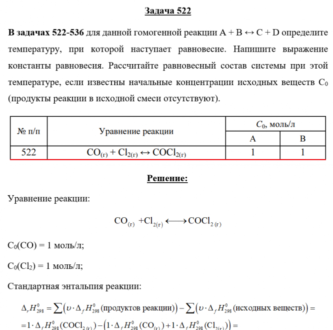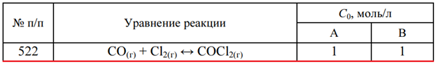 Задача 522 - для данной гомогенной реакции А + В ↔ С + D определите температуру, при которой наступает равновесие. Напишите выражение константы равновесия. Рассчитайте равновесный состав системы при этой температуре, если известны начальные концентра