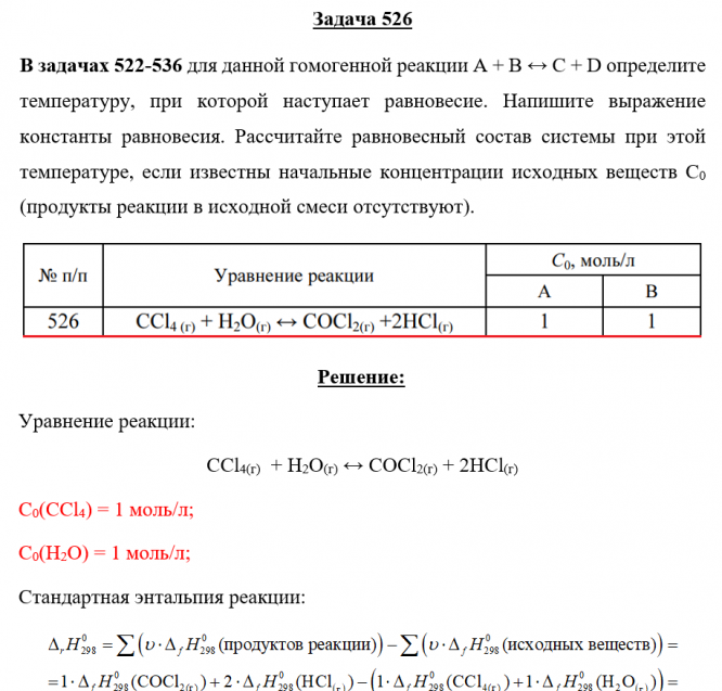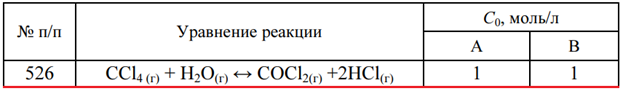 Задача 526 - для данной гомогенной реакции А + В ↔ С + D определите температуру, при которой наступает равновесие. Напишите выражение константы равновесия. Рассчитайте равновесный состав системы при этой температуре, если известны начальные концентра