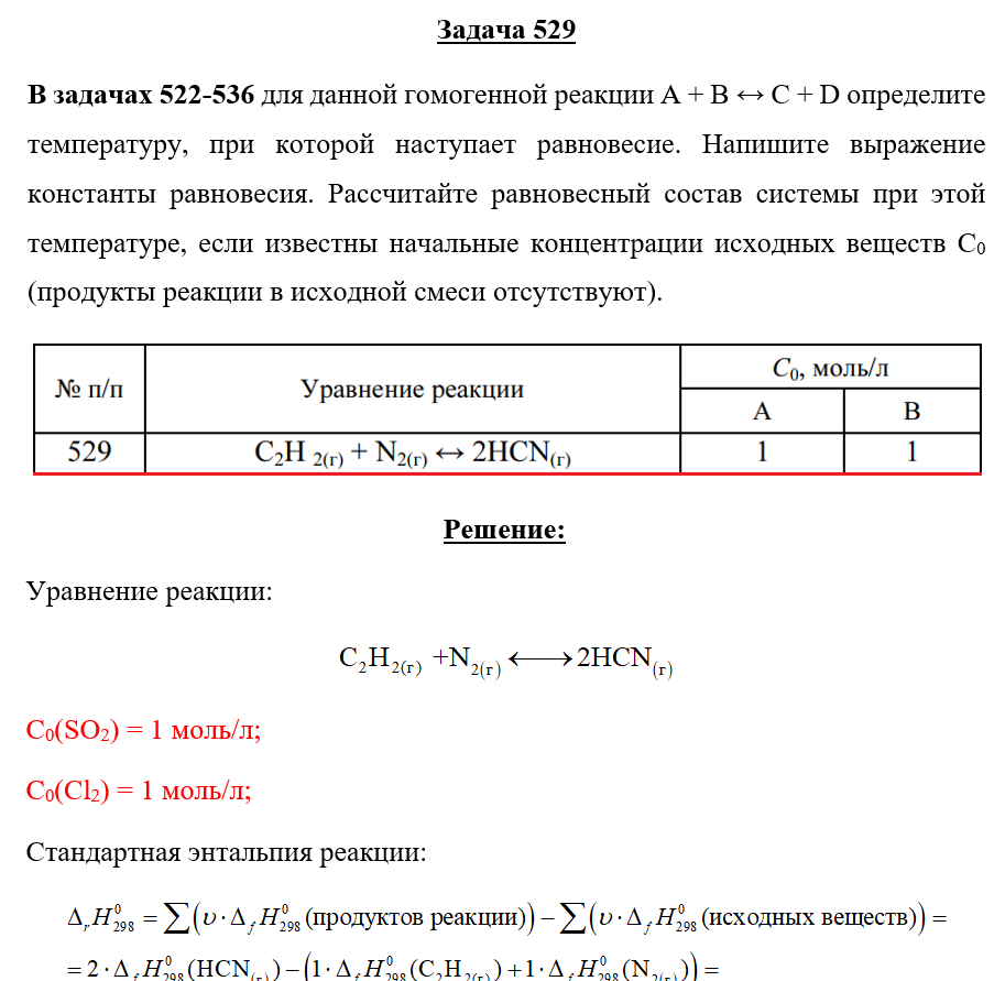Задача 529 - для данной гомогенной реакции А + В ↔ С + D определите температуру, при которой наступает равновесие. Напишите выражение константы равновесия. Рассчитайте равновесный состав системы при этой температуре, если известны начальные концентра