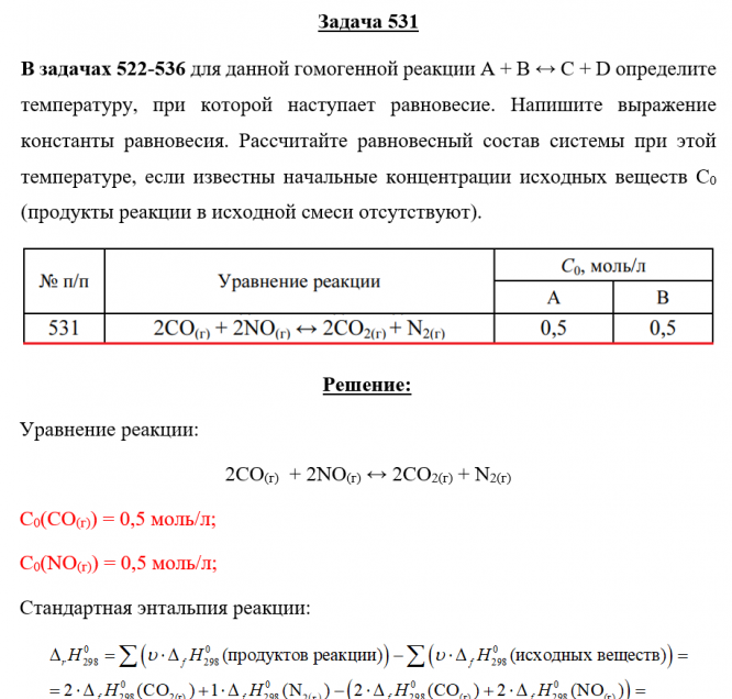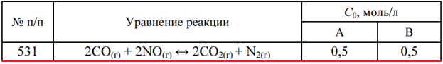 Задача 531 - для данной гомогенной реакции А + В ↔ С + D определите температуру, при которой наступает равновесие. Напишите выражение константы равновесия. Рассчитайте равновесный состав системы при этой температуре, если известны начальные концентра
