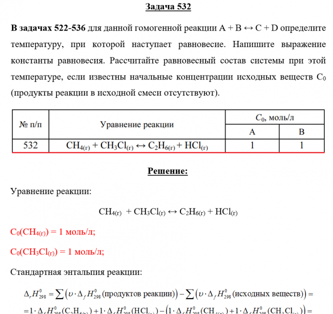 Задача 532 - для данной гомогенной реакции А + В ↔ С + D определите температуру, при которой наступает равновесие. Напишите выражение константы равновесия. Рассчитайте равновесный состав системы при этой температуре, если известны начальные концентра