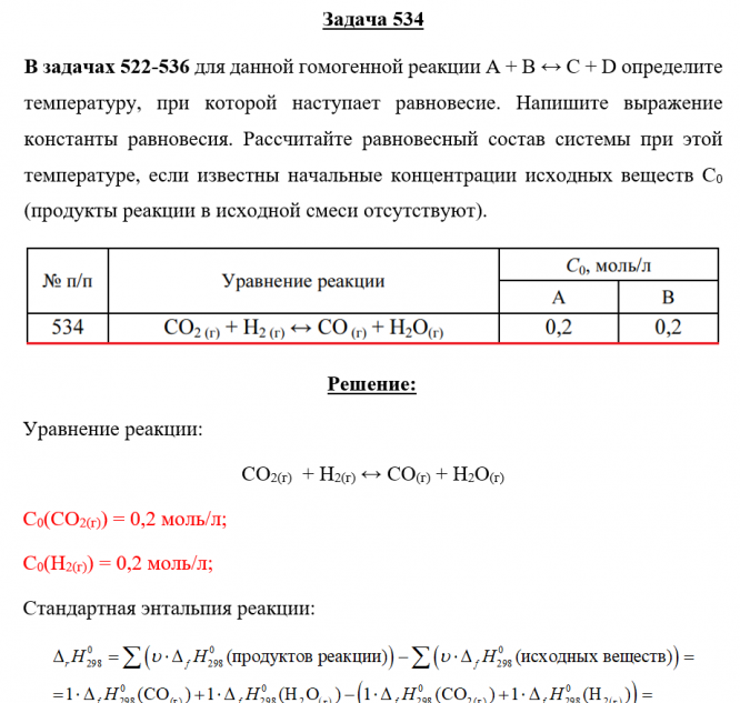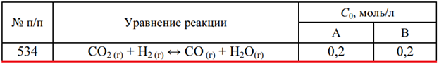 Задача 534 - для данной гомогенной реакции А + В ↔ С + D определите температуру, при которой наступает равновесие. Напишите выражение константы равновесия. Рассчитайте равновесный состав системы при этой температуре, если известны начальные концентра