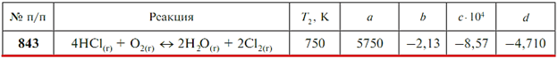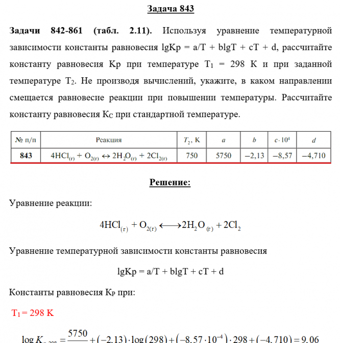 Задача 843 - Используя уравнение температурной зависимости константы равновесия lgKp = a/T + blgT + cT + d, рассчитайте константу равновесия Kp при температуре Т1 = 298 К и при заданной температуре Т2. Не производя вычислений, укажите, в каком направ