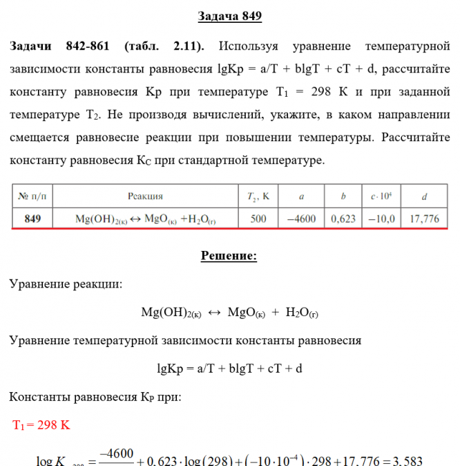 Главная » Учебные материалы » Химия » Решения задач » Несколько классов/семестров » Номер 849 » Задача 849 - Используя уравнение температурной зависимости константы равновесия lgKp = a/T + blgT + cT + d, рассчитайте константу равновесия Kp при температуре Т1 = 298 К и при заданной температуре Т2. Не производя вычислений, укажите, в каком направ