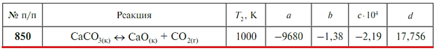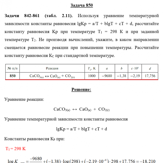 Задача 850 - Используя уравнение температурной зависимости константы равновесия lgKp = a/T + blgT + cT + d, рассчитайте константу равновесия Kp при температуре Т1 = 298 К и при заданной температуре Т2. Не производя вычислений, укажите, в каком направ
