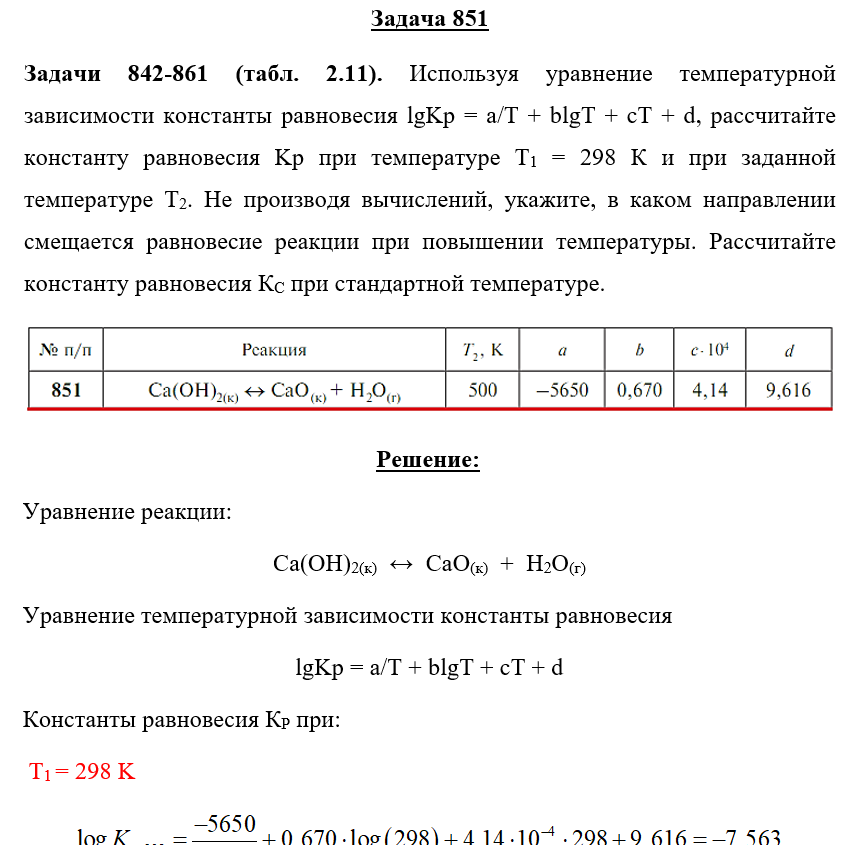 Задача 851 - Используя уравнение температурной зависимости константы равновесия lgKp = a/T + blgT + cT + d, рассчитайте константу равновесия Kp при температуре Т1 = 298 К и при заданной температуре Т2. Не производя вычислений, укажите, в каком направ