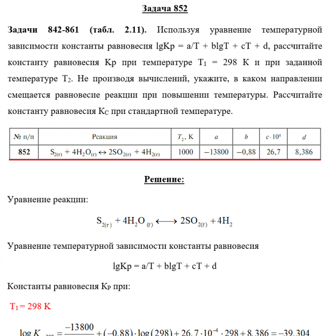 Задача 852 - Используя уравнение температурной зависимости константы равновесия lgKp = a/T + blgT + cT + d, рассчитайте константу равновесия Kp при температуре Т1 = 298 К и при заданной температуре Т2. Не производя вычислений, укажите, в каком направ